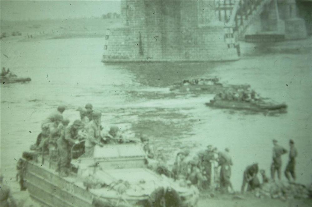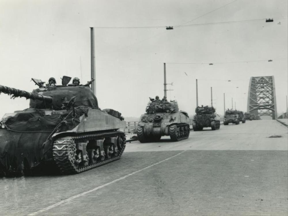 Britse Sherman tanks over de Waalbrug, Nijmegen