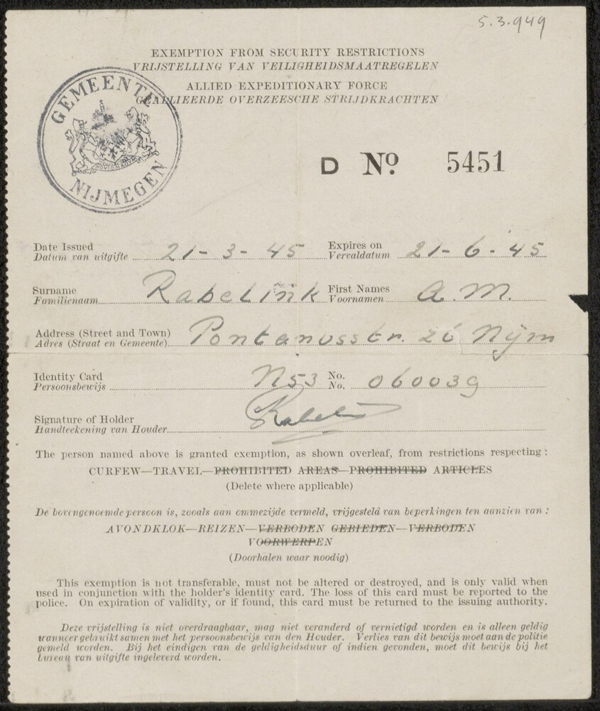 Vrijstelling/Permit A.M. Rabelink, 21 juni 1945