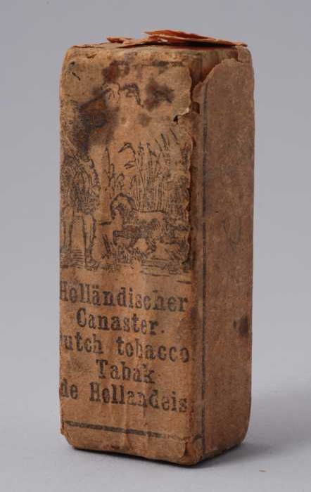 Miniatuur pakje tabak, houten blokje met papieren ta...