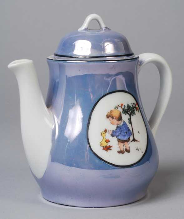 Theepot van blauw parelmoer kinderservies met jongen...