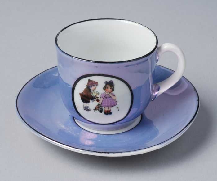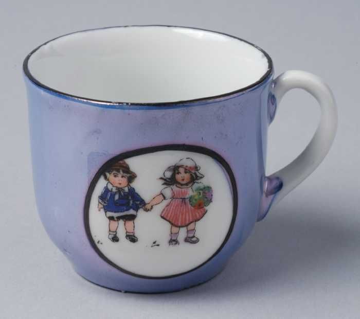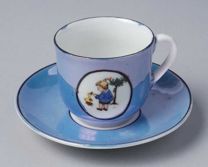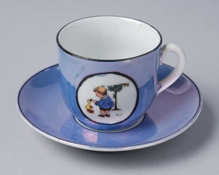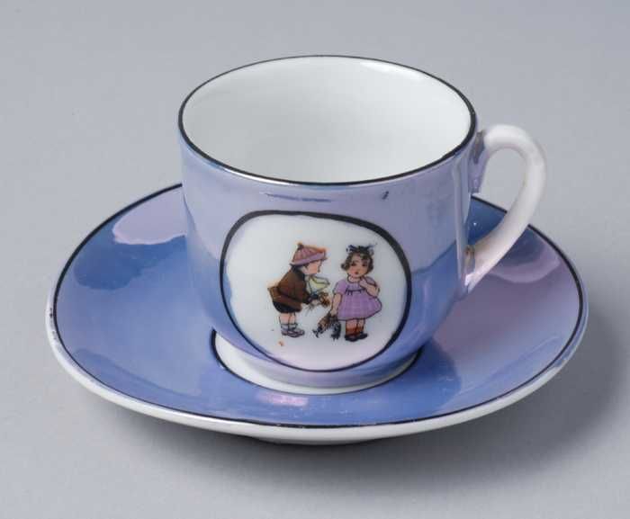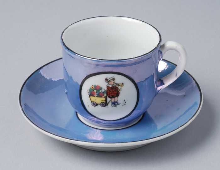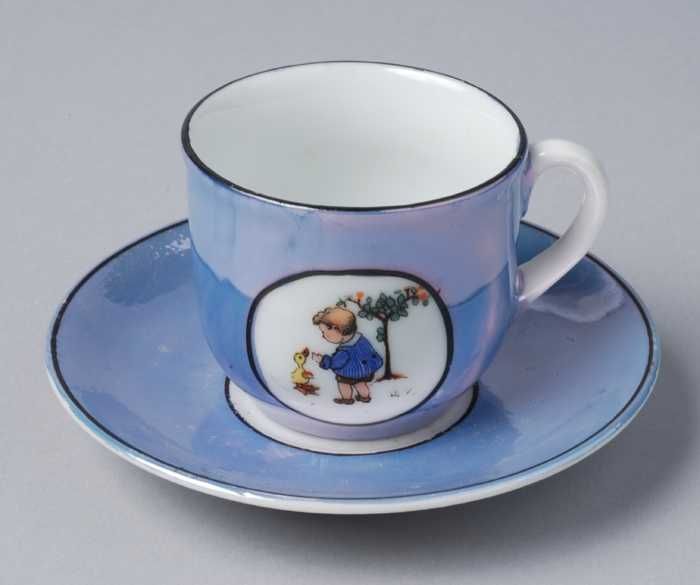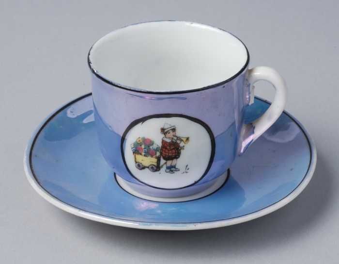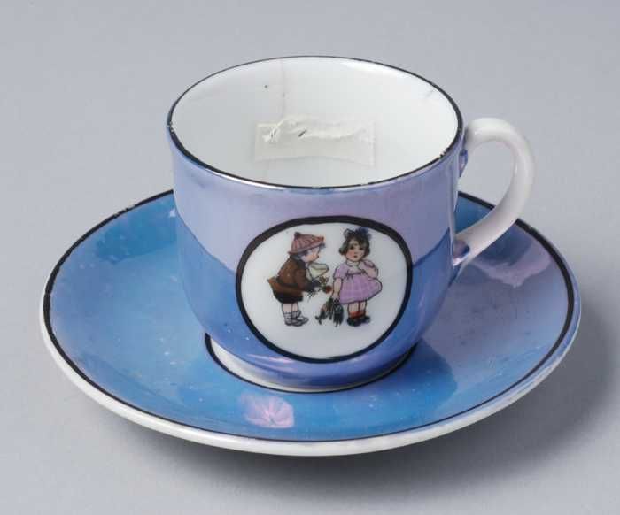 Kop en schotel van blauw parelmoer kinderservies met...