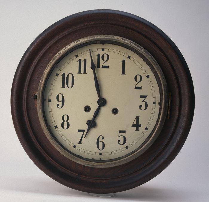 Wandklok met ronde, gegolfde mahoniehoutkleurige lijst