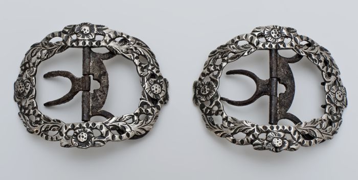 Twee zilveren schoengespen met bloemmotief