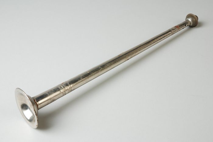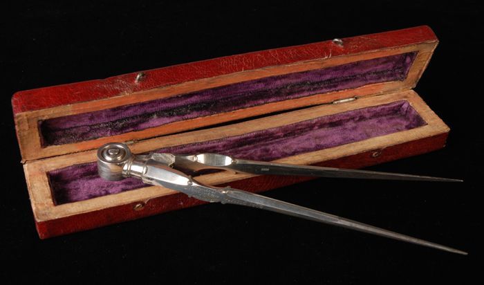 Zilveren passer in rode doos met paarse bekleding, "...