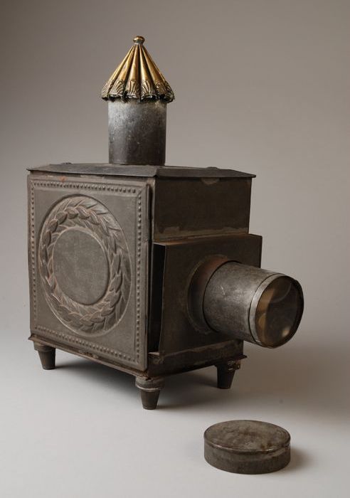 Toverlantaarn met drie lenzen, lensdop en schoorstee...