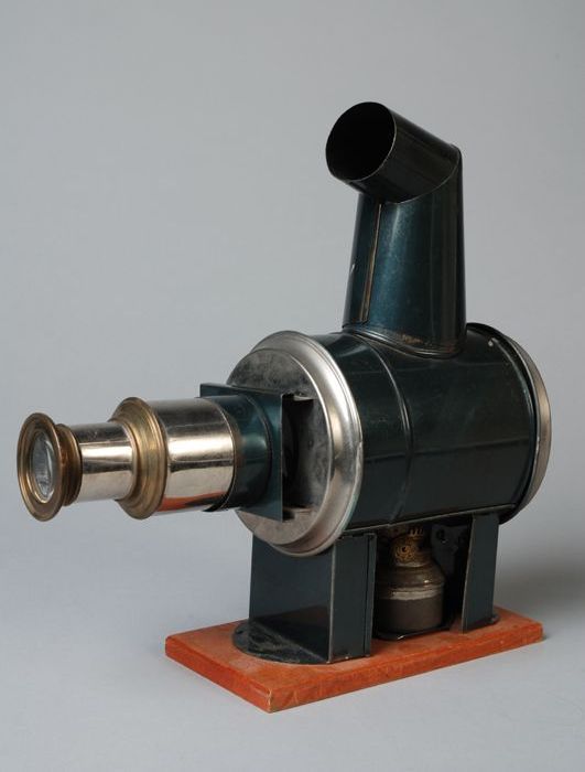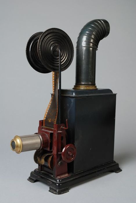 Filmprojector met lens, filmspoel, schoorsteen en ol...