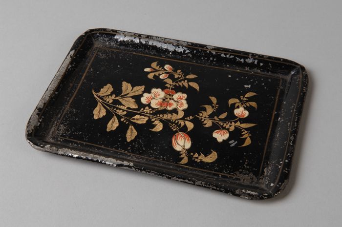 Dienblad met een rechthoekig theeblik en een rond bl...