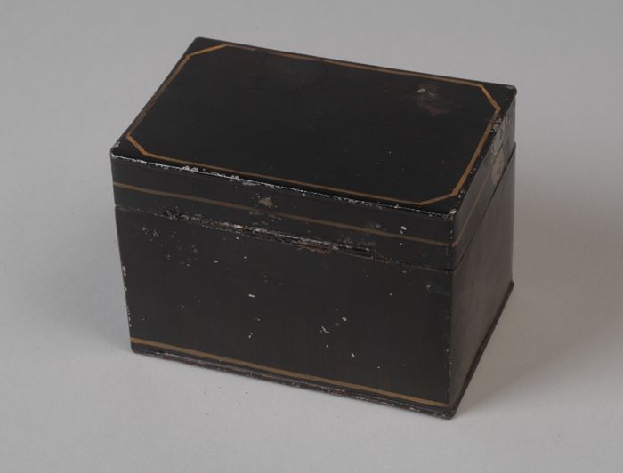 Zwart gelakt miniatuur theeblik met klepdeksel, rech...