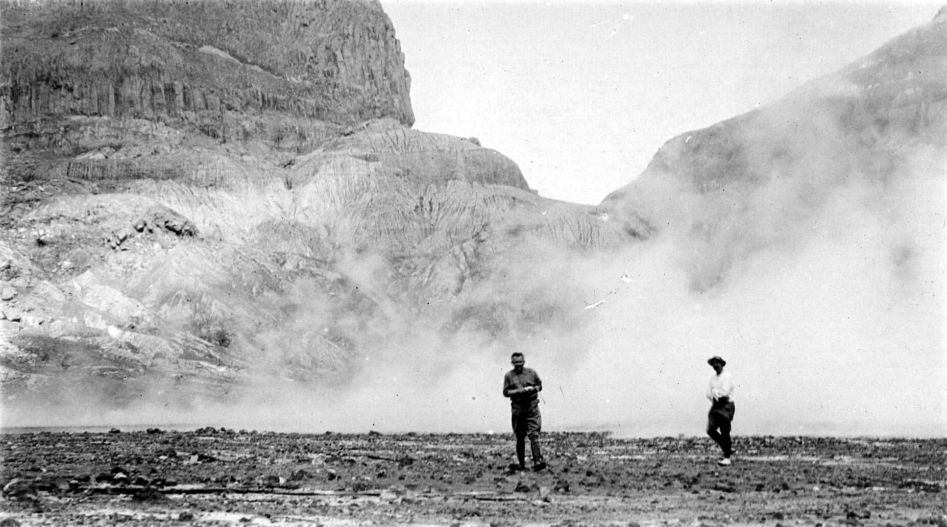 Twee mannen op de bodem van de krater van de Keloed ...