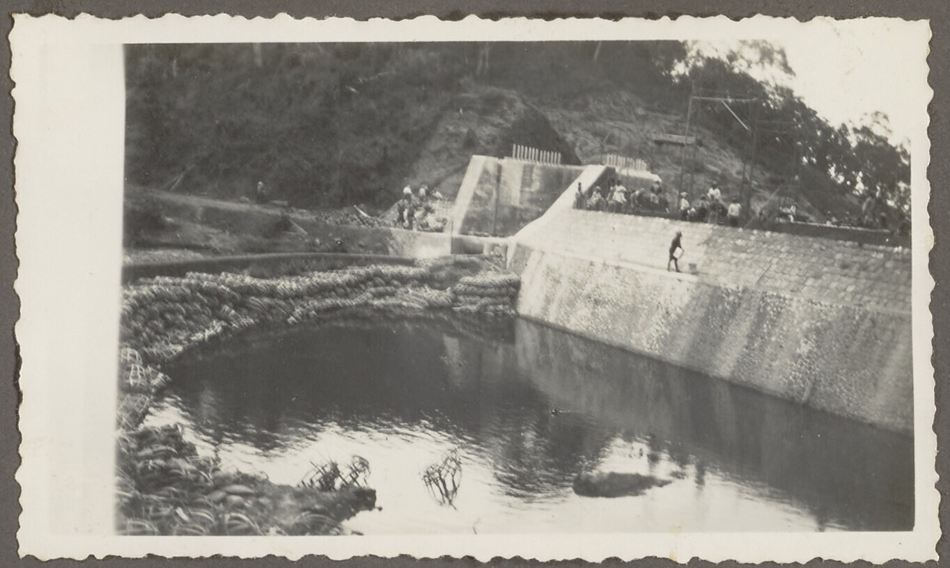 De Javaanse arbeiders zijn bezig met de voetingmuur ...
