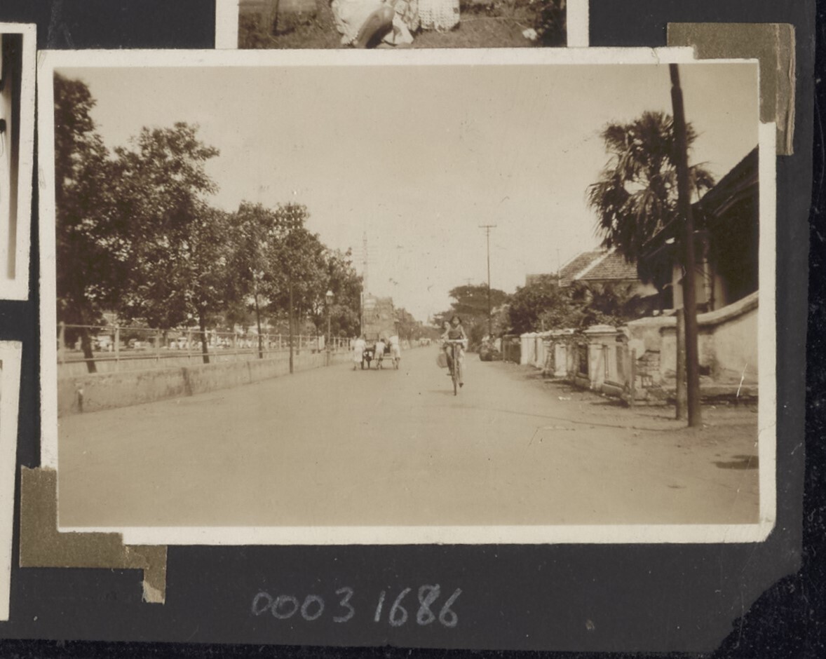 Straatgezicht met fietsende Indo-Europese meisjes, B...