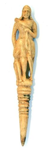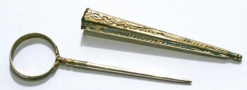 Pijpenwroeter van been met gedecoreerde steel waarop...