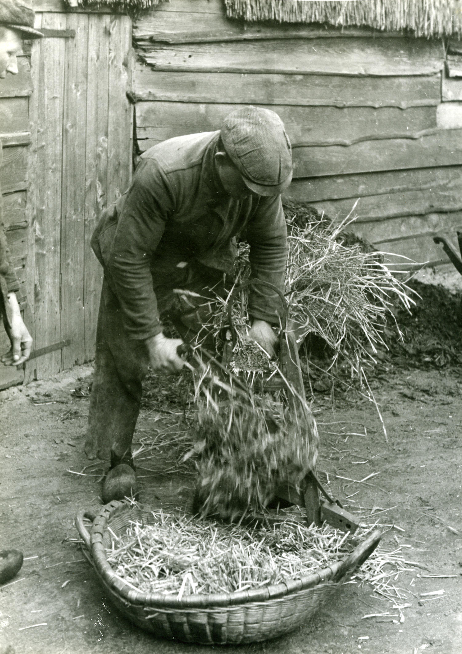 Snijden van strohaksel, Orvelte, 1944 (zwart-wit foto)