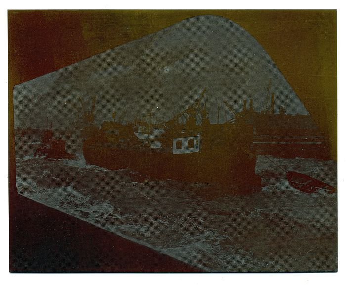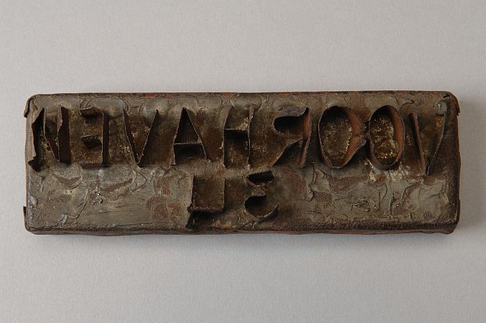 Metalen cliché van oud Rotterdam, Maasgezicht met bi...