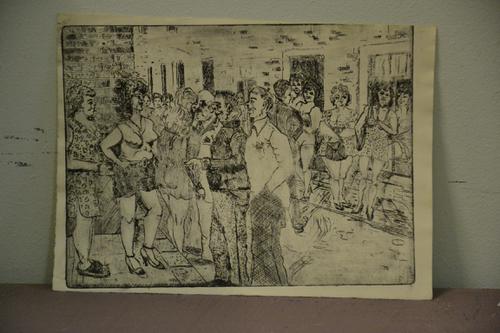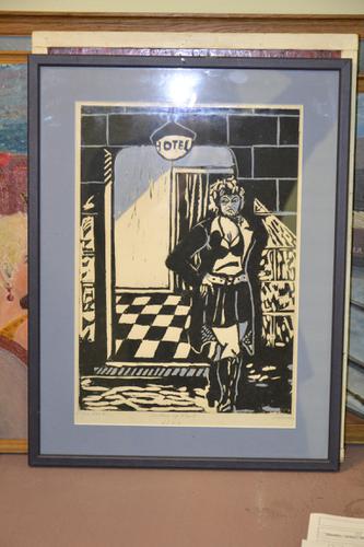 wachten op klant, lino, ingekleurd