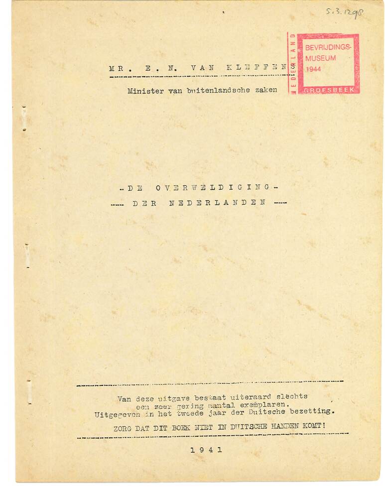 Brochure: Mr. E.N. van Kleffens; De overweldiging de...