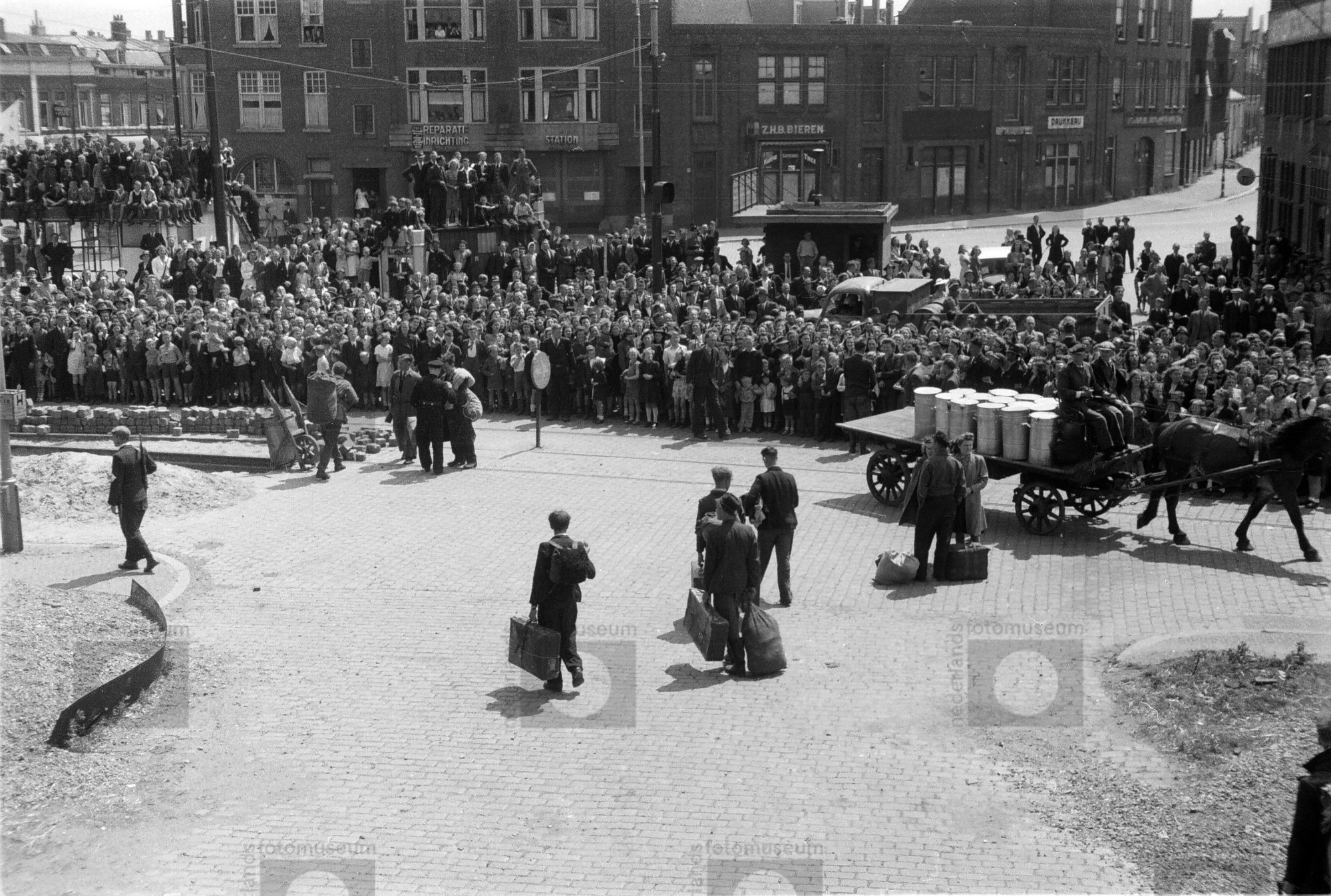 Een menigte staat langs een plein te wachten (1945)