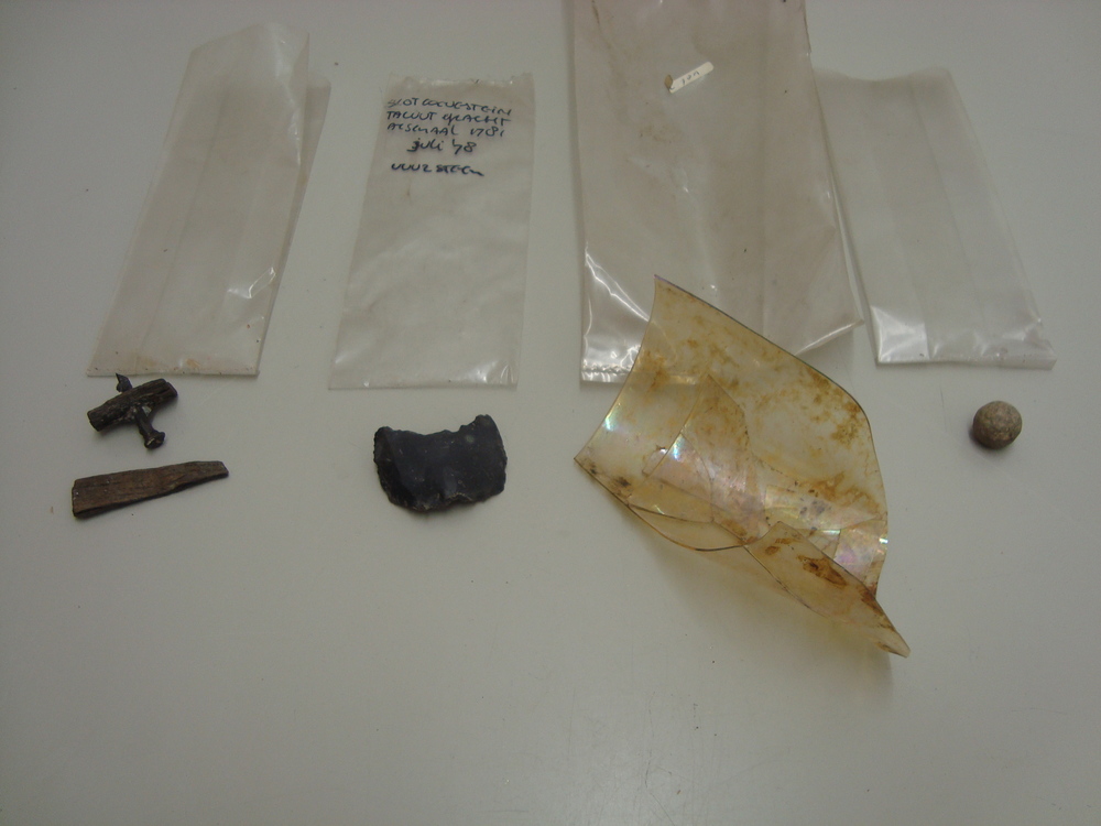 Fragmenten, been/ijzer/baksteen/aardewerk/hout,