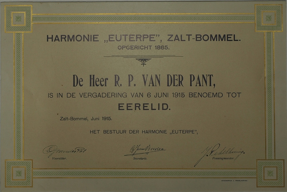 Diploma van Euterpe aan Van der Pant wegens erelidma...