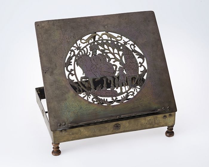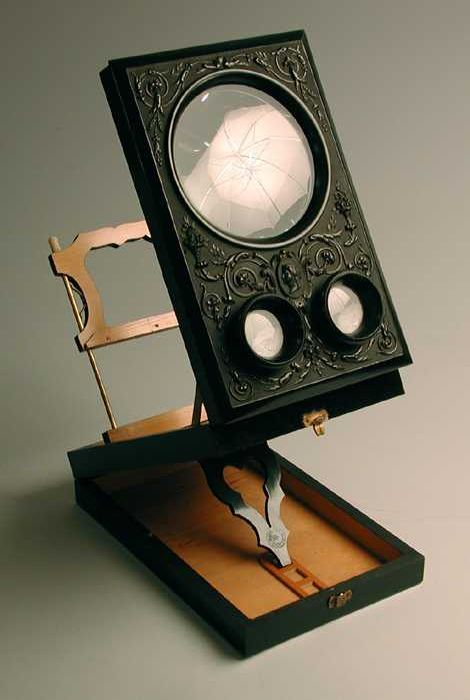 Zwarte uitklapbare tafelstereoscoop, voorzijde met d...