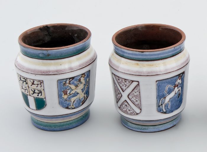 Twee in opdracht gemaakte meerkleurige aardewerk vaa...