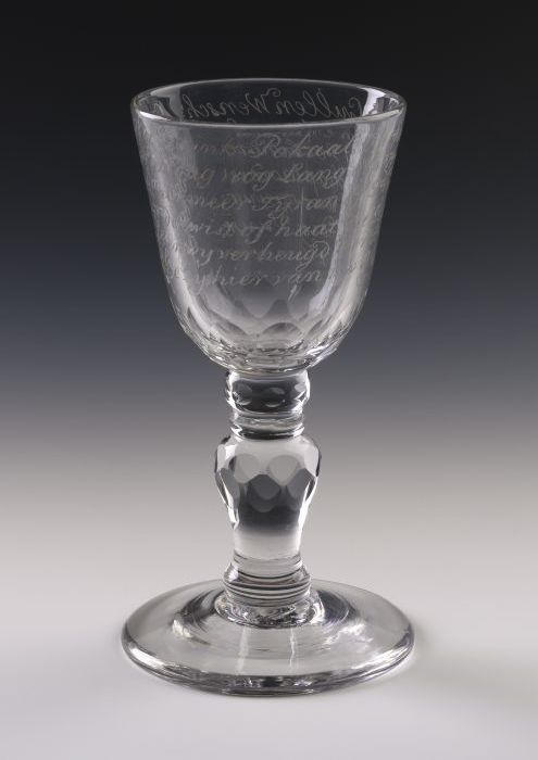 Zwaar kelkglas, wijnglas, gegraveerd met zes versreg...