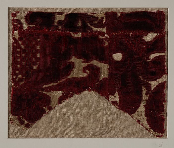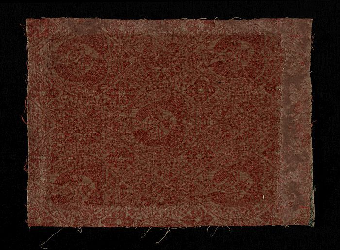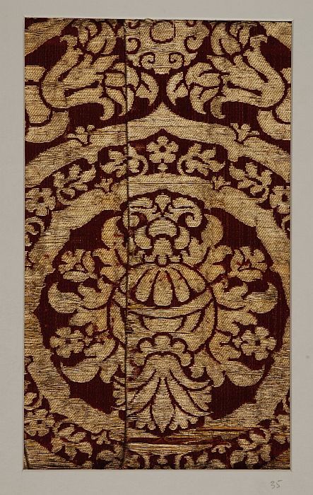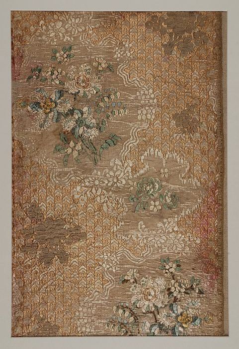 Textielfragment van ingeweven damasten zijde met blo...