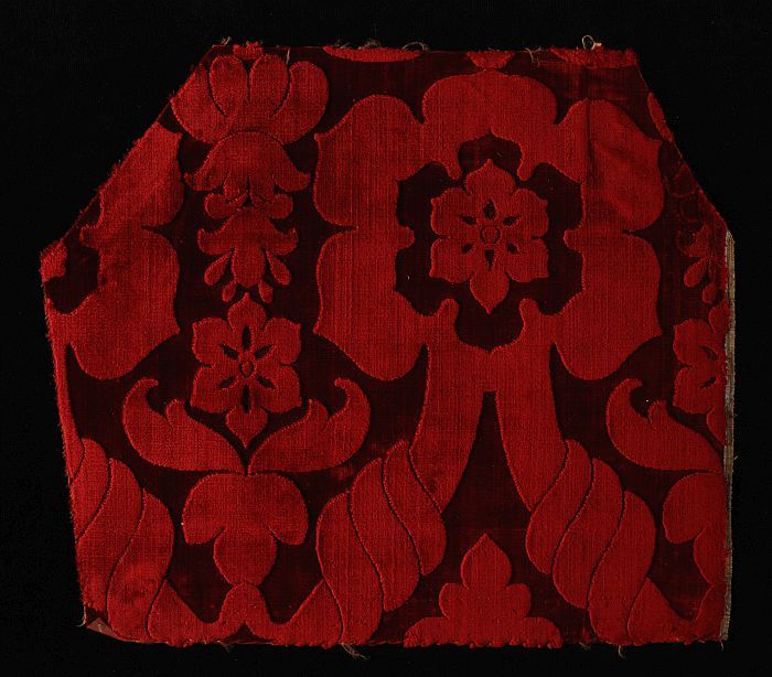 Textielfragment van rood fluweel met bloempatroon