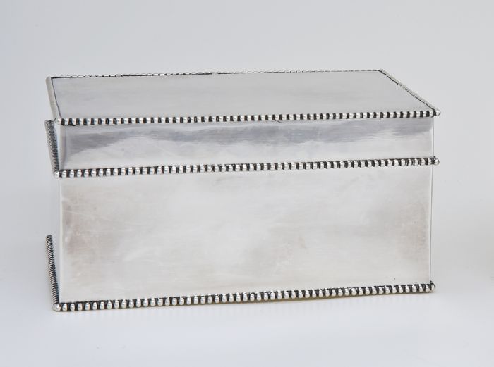 Rechthoekige zilveren koektrommel, met parelranden