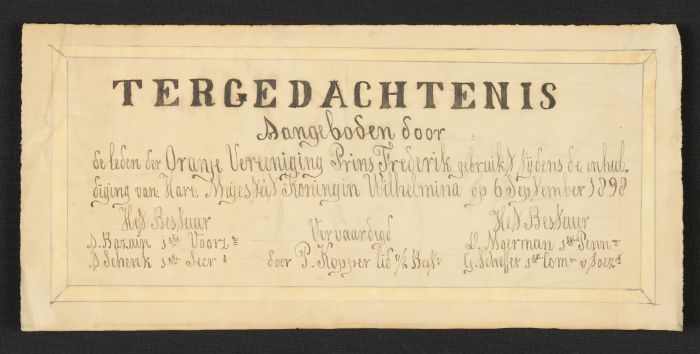 Oranje en wit dekservet met "NEDERLAND ZAL HERRIJZEN...