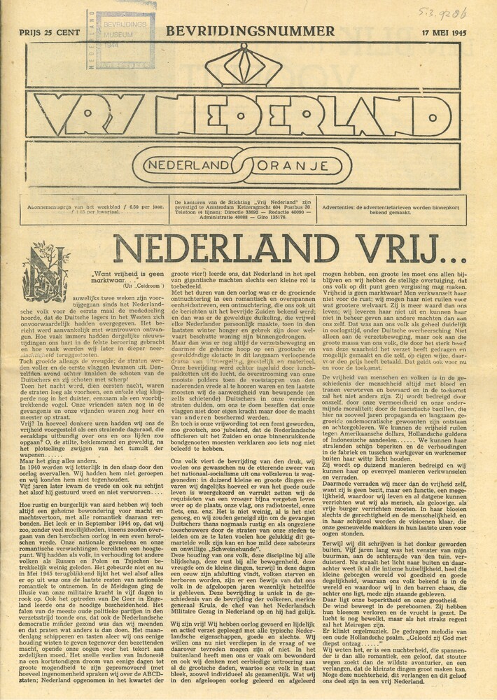 Vrij Nederland (ex-illegaliteit), bevrijdingsnummer,...