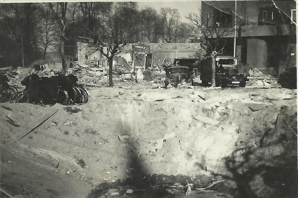 bombardement Nijmegen; bomkrater Spoorstraat-Kronenb...