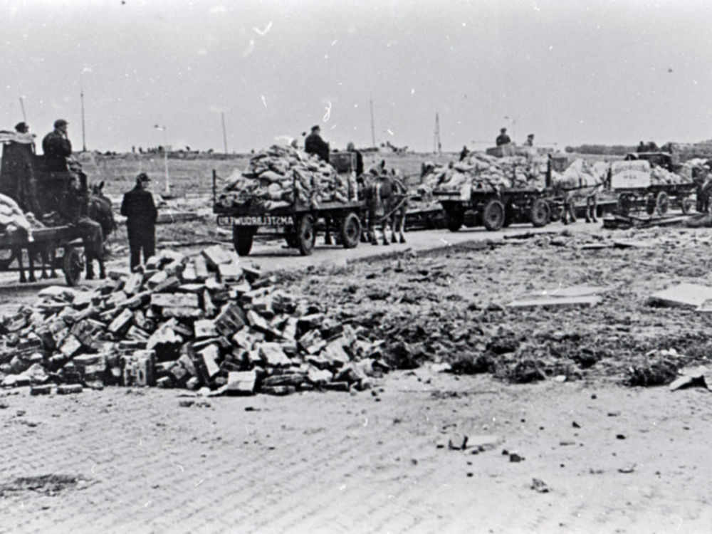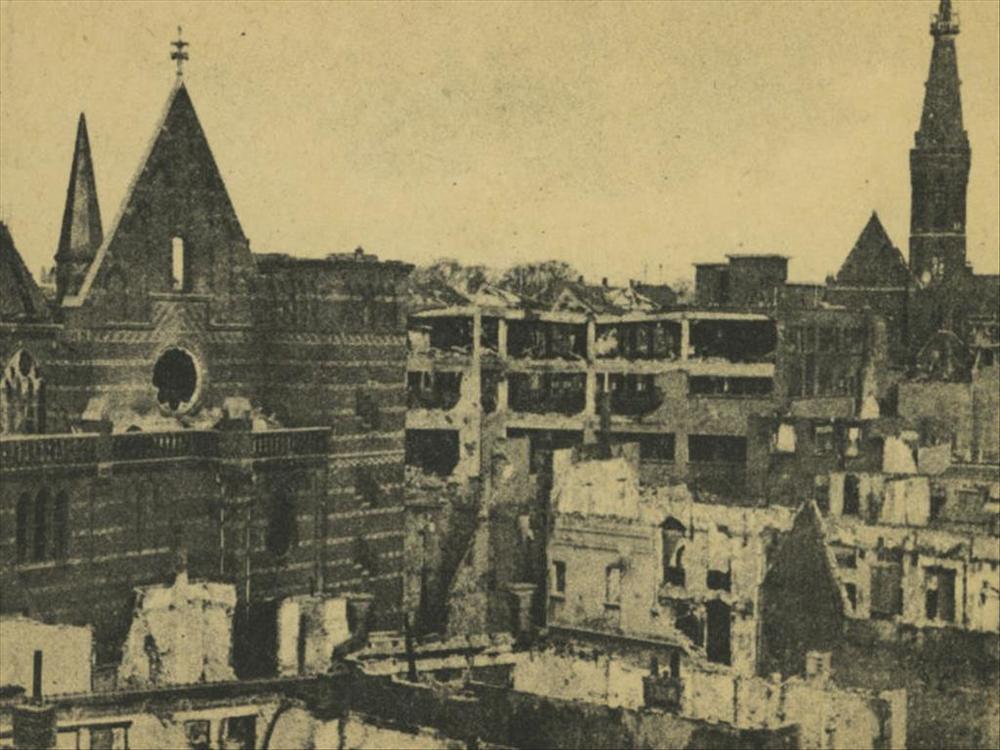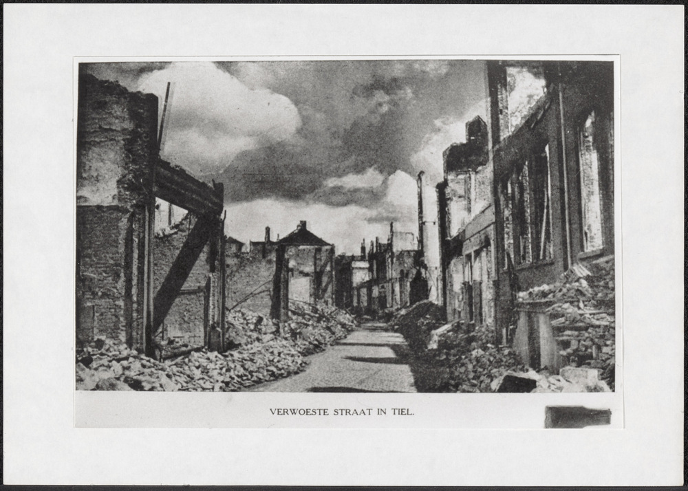 Afbeelding van een verwoeste straat in Tiel