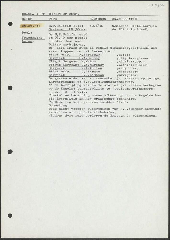 Crash-lijst Bergen op Zoom 28 april 1944.