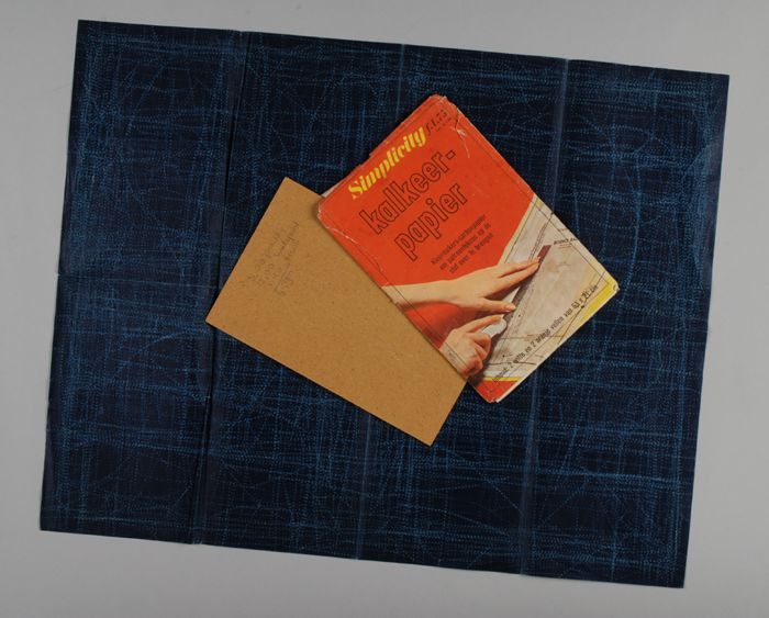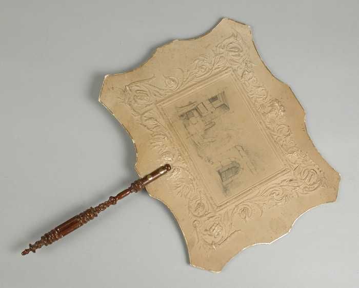 Haardschermpje, kartonnen blad met reliëfrand en pot...