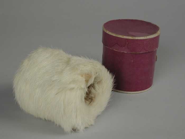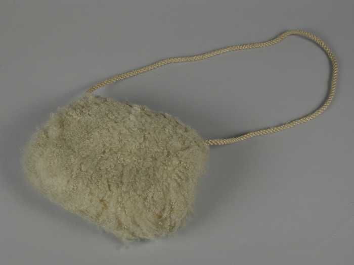 Kleine mof van krullerige witte wol, voering van crè...