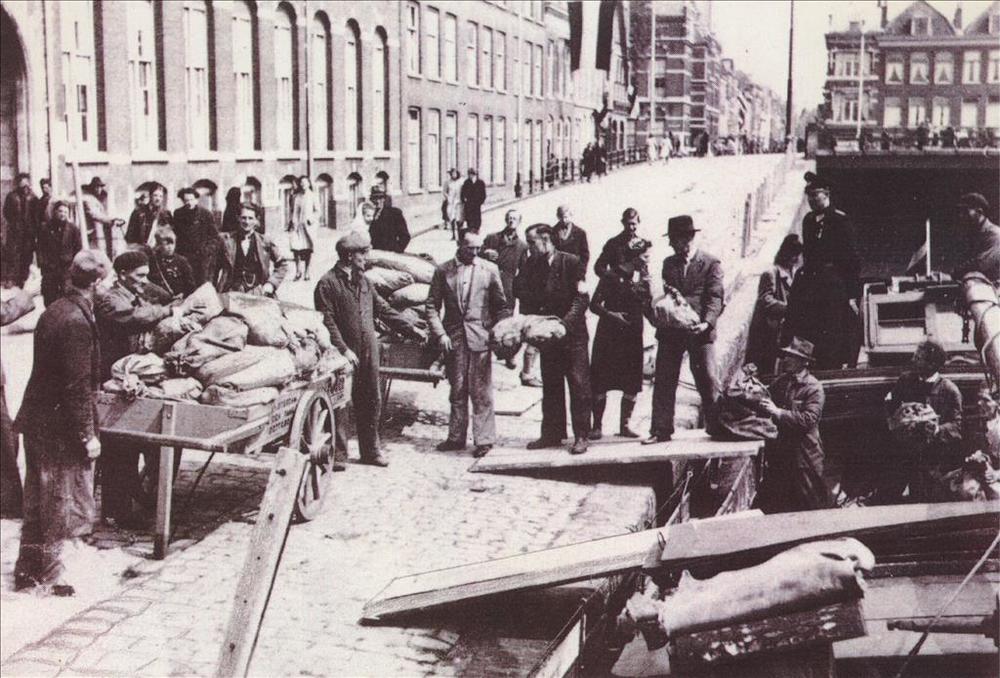 Een rij mannen haalt zakken voedsel uit een boot, op...