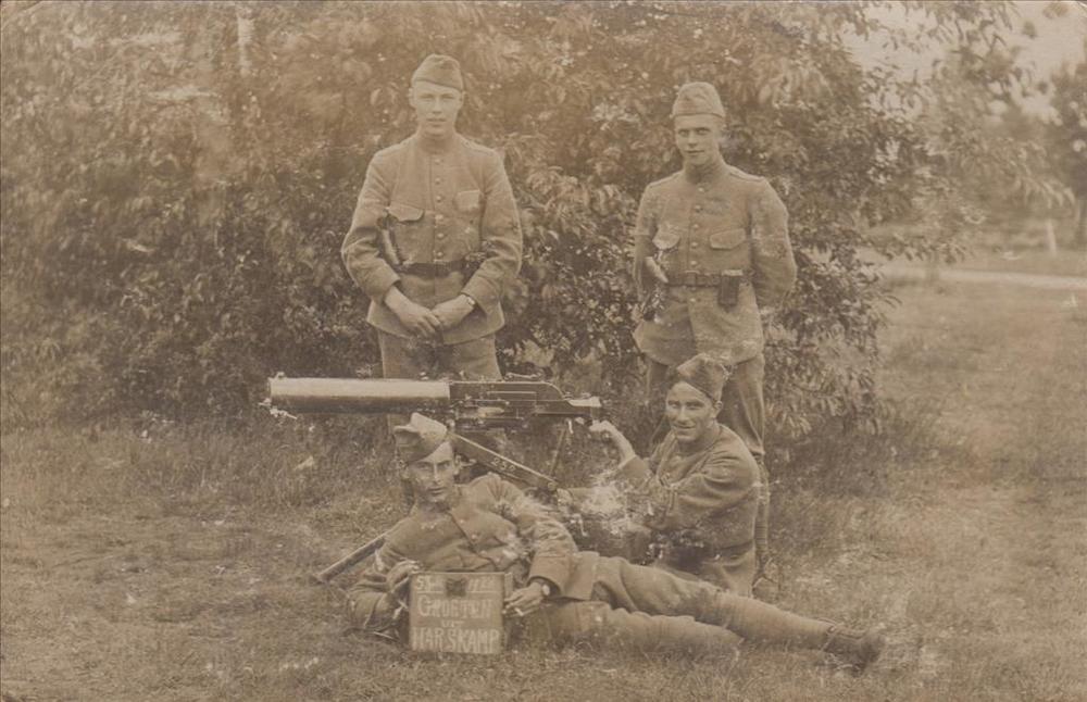 Foto van vier Nederlandse militairen bij een machine...