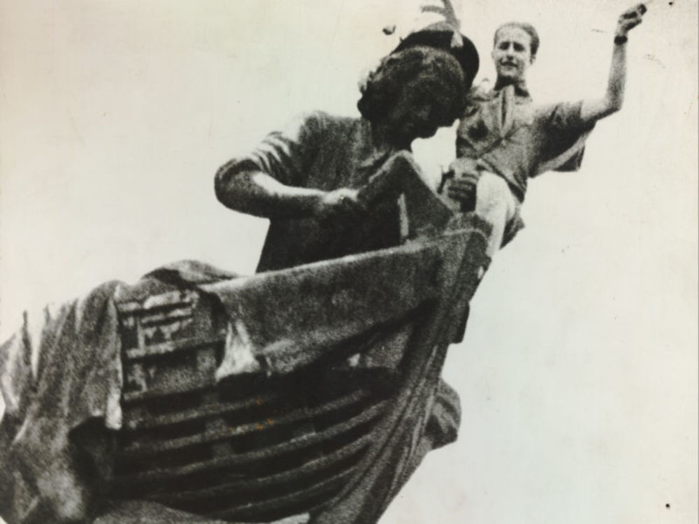 Foto jongen met Britse vlag op standbeeld Tsaar Pete...