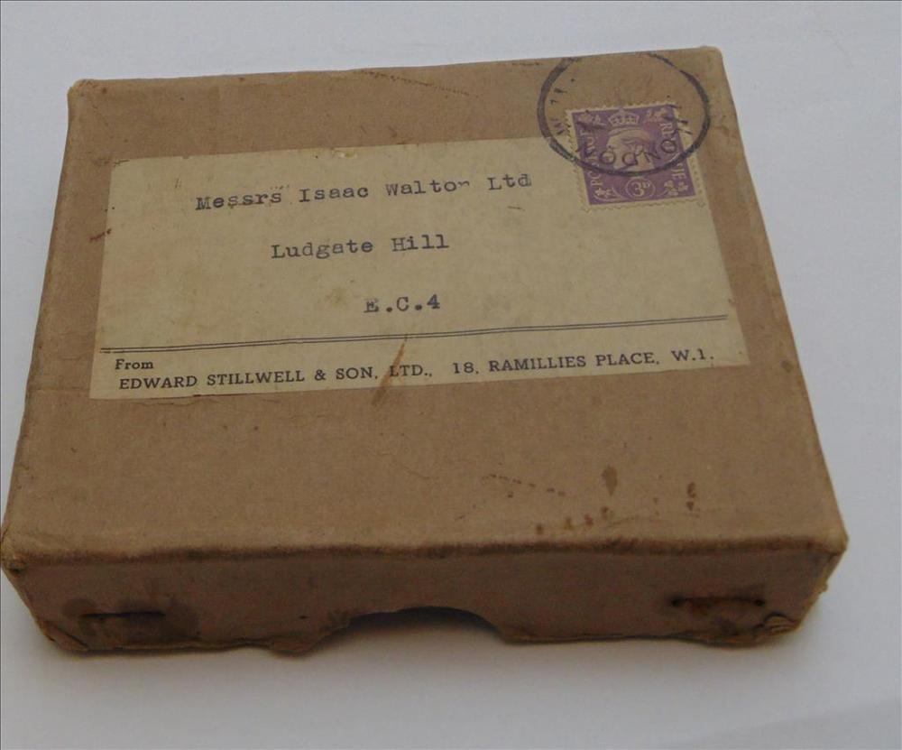 doosje, karton, met daarop een postzegel van de laat...