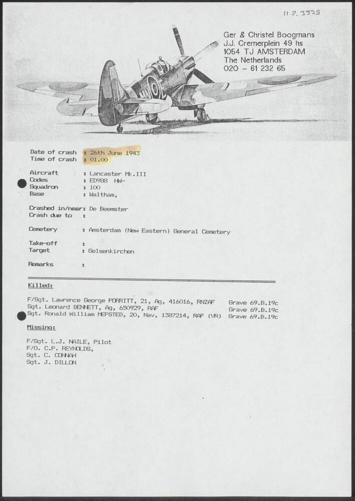 Crashrapport Lancaster ED988 26 juni 1943.