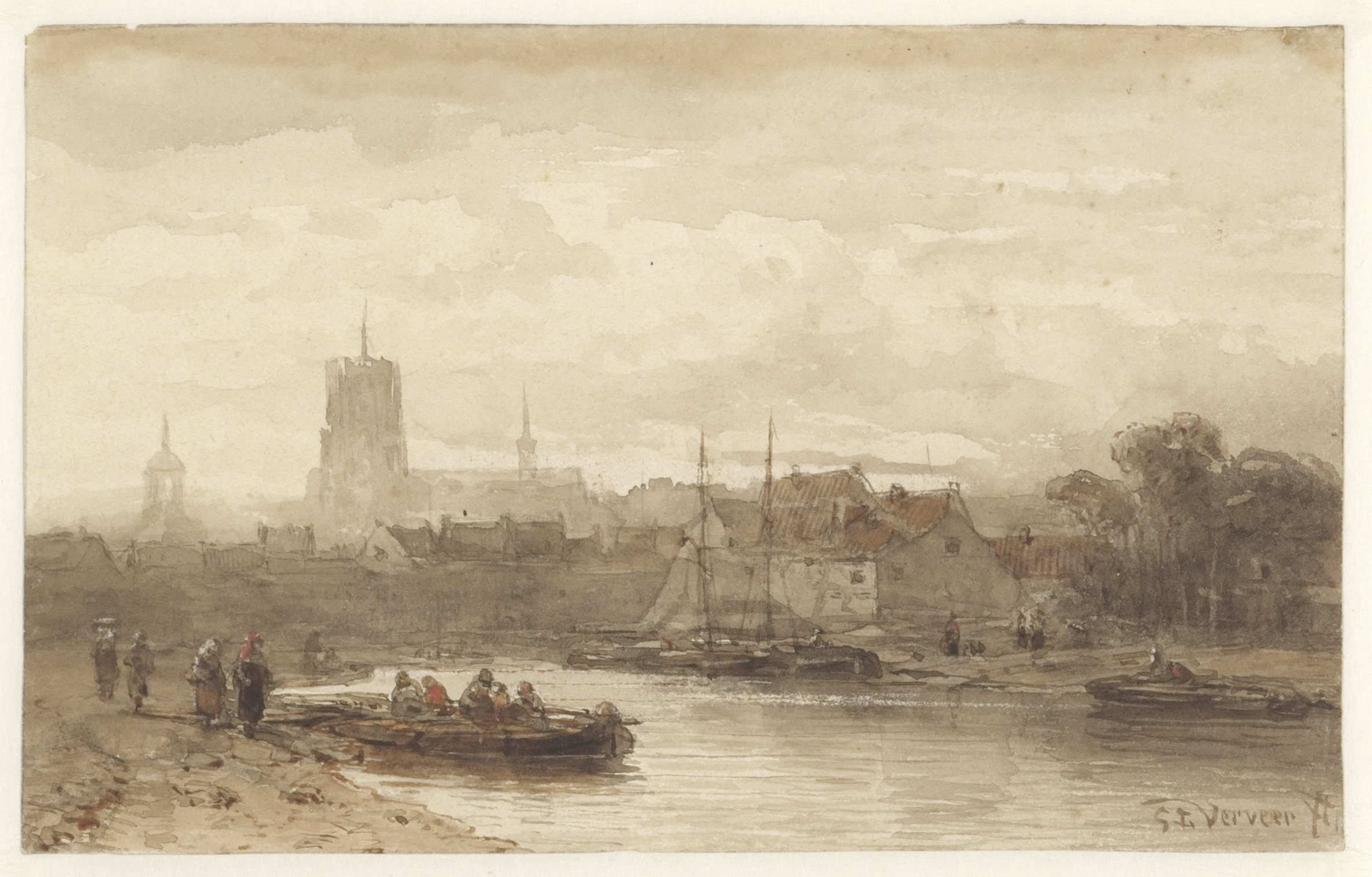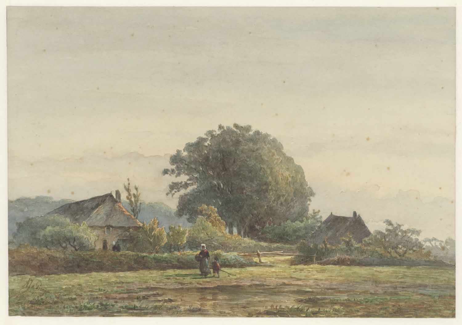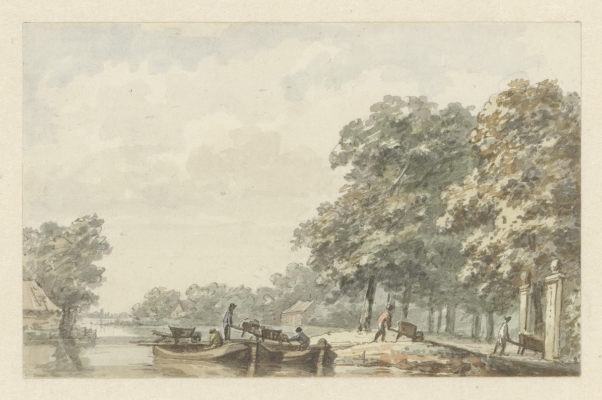Koeien aan een water bij Gouda. Molen in landschap (...