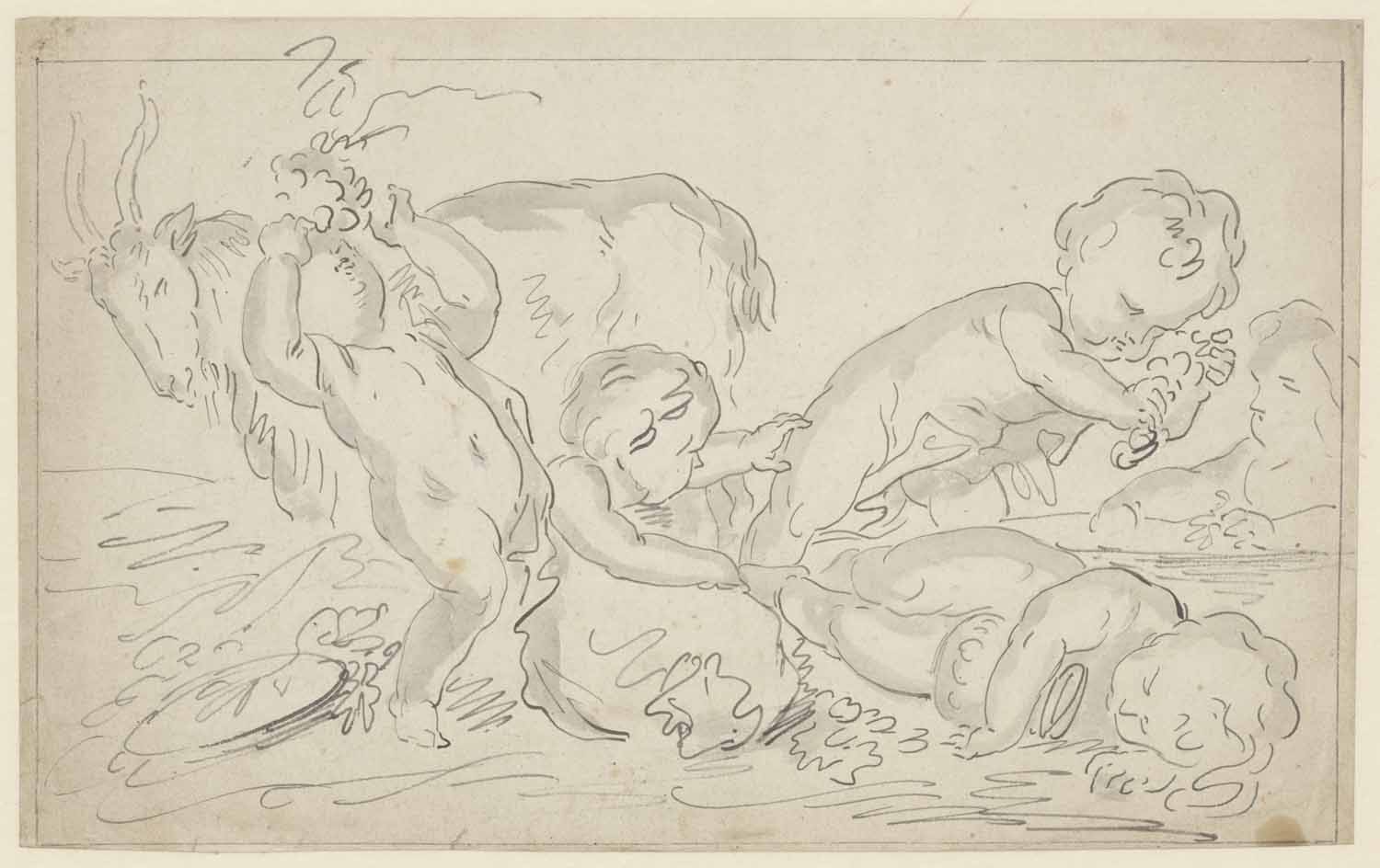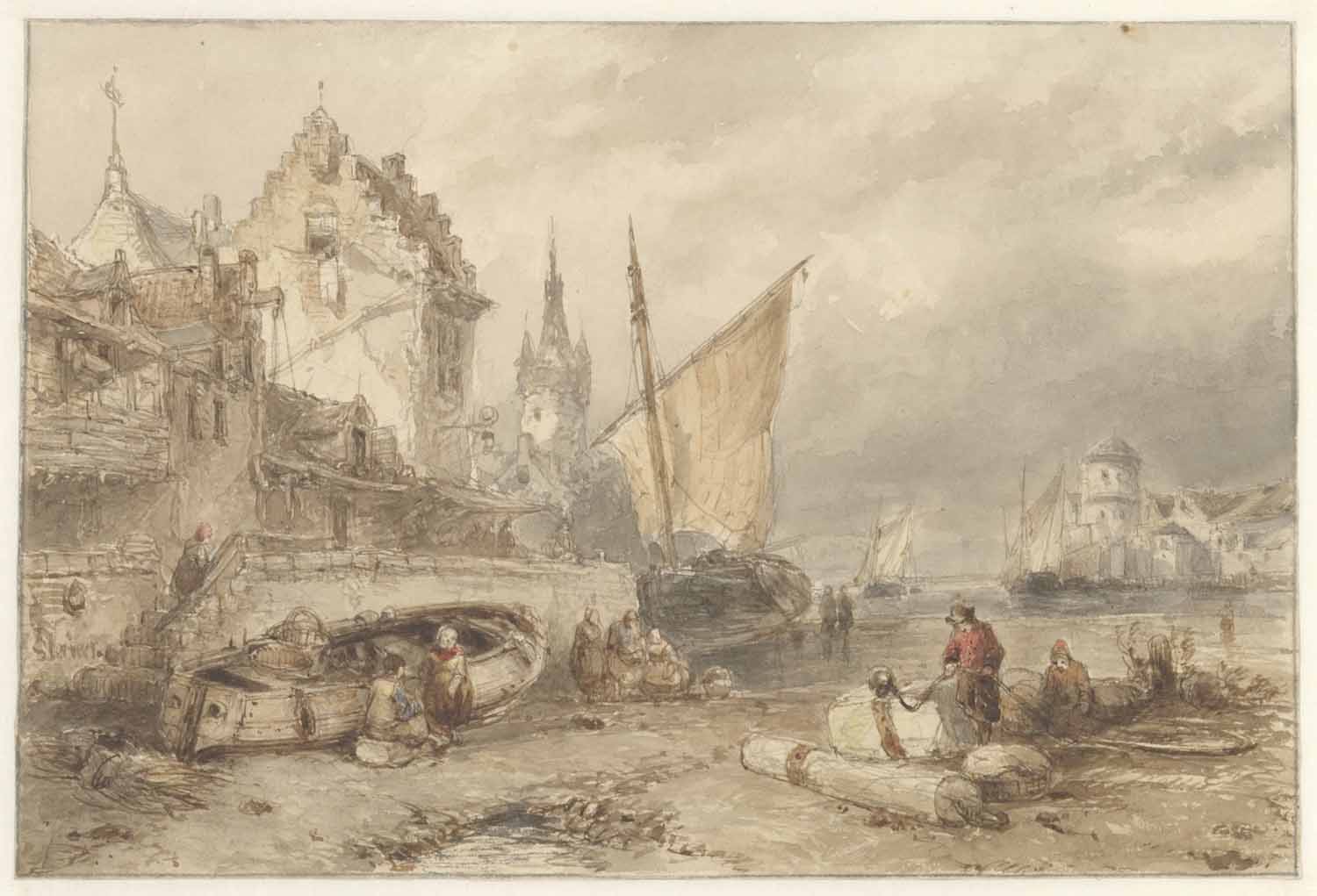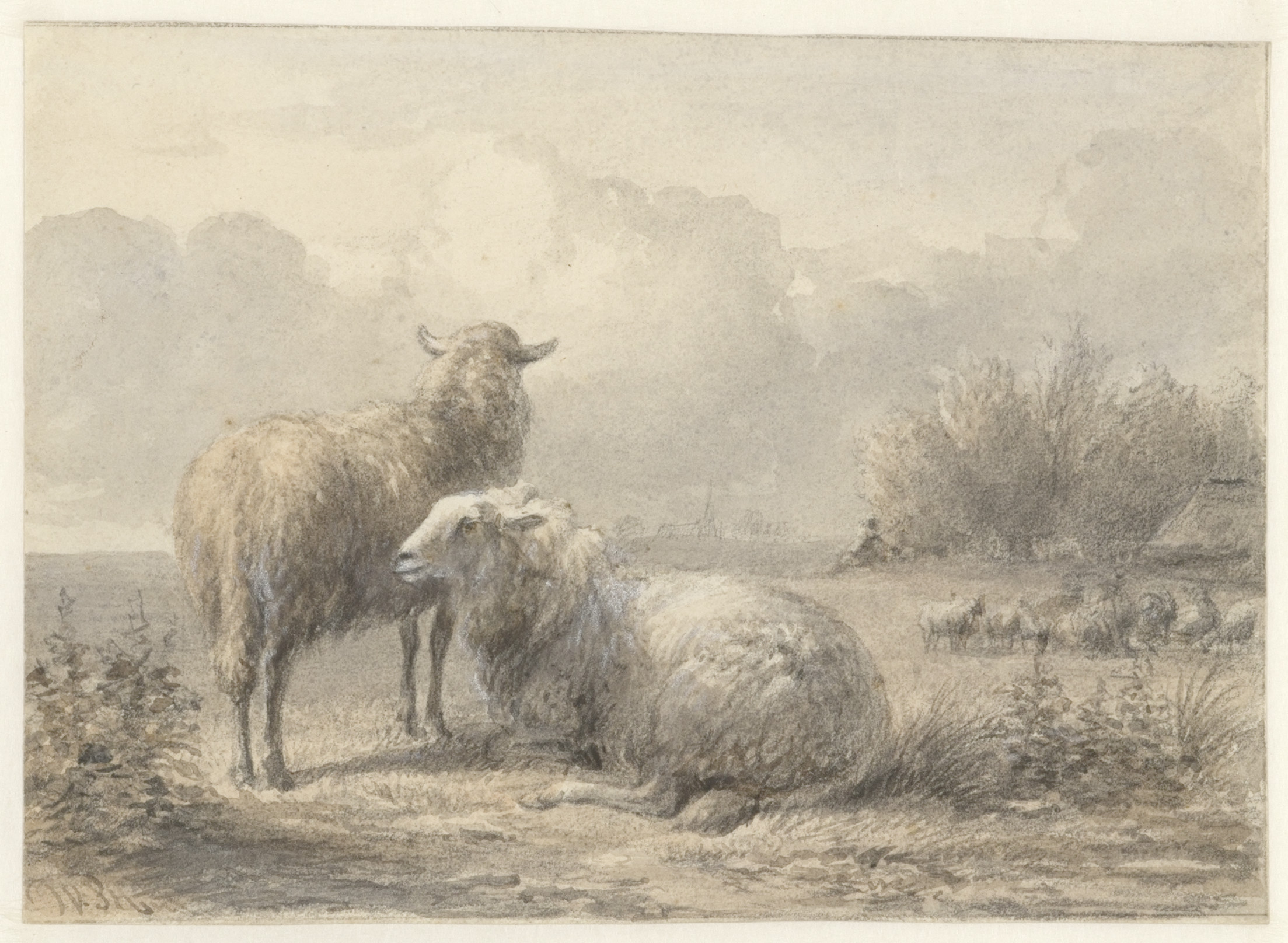 Koeien aan een water bij Gouda. Molen in landschap (...