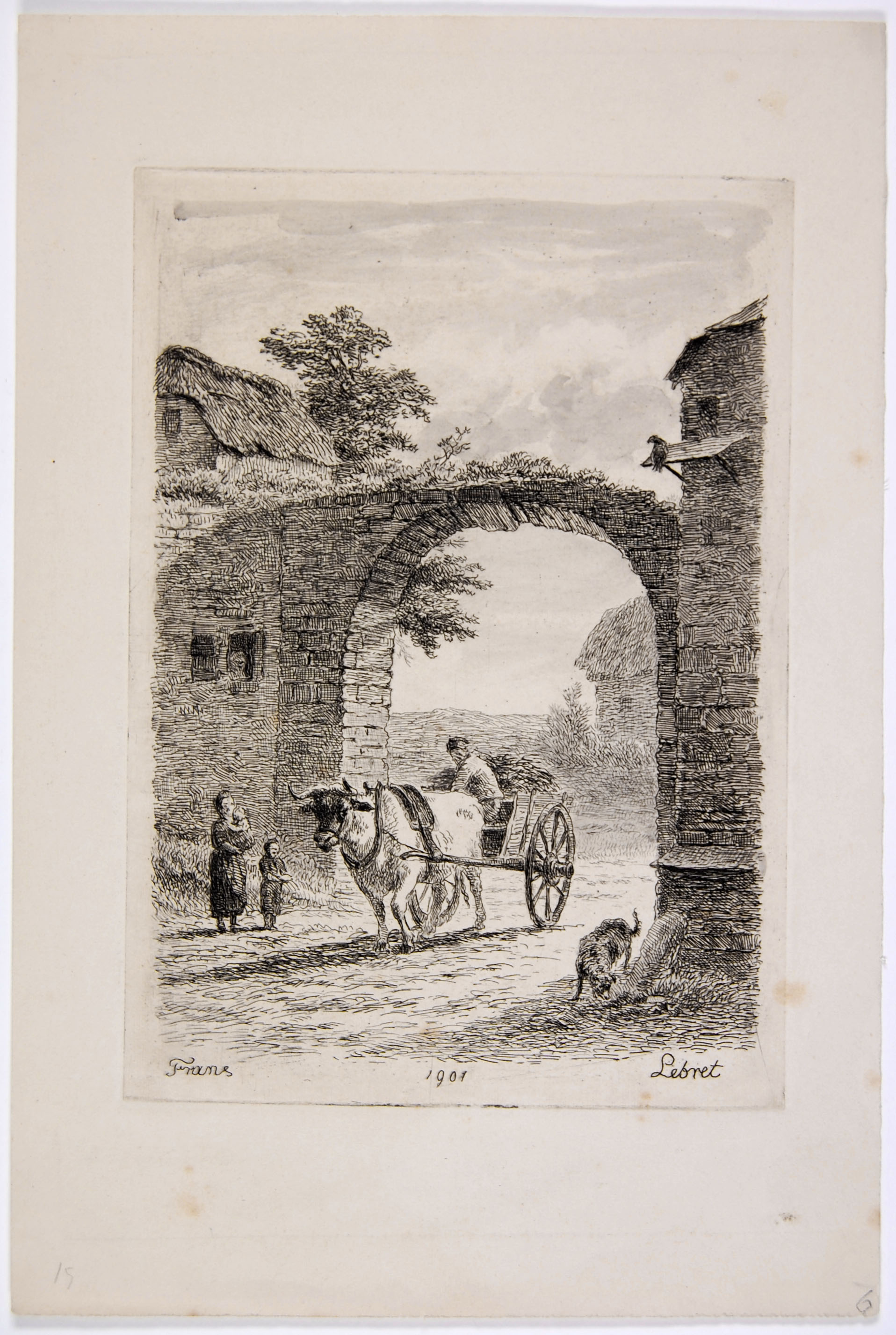 Landschap met poort en ossenwagen