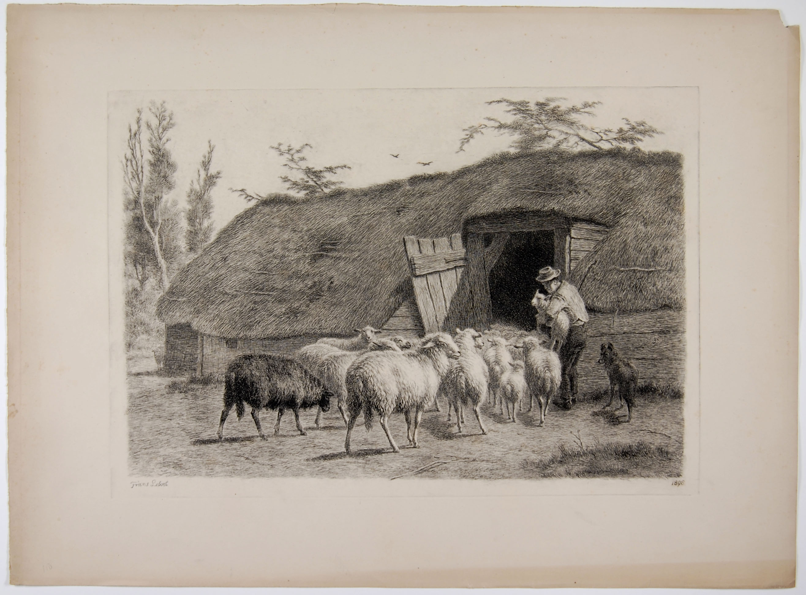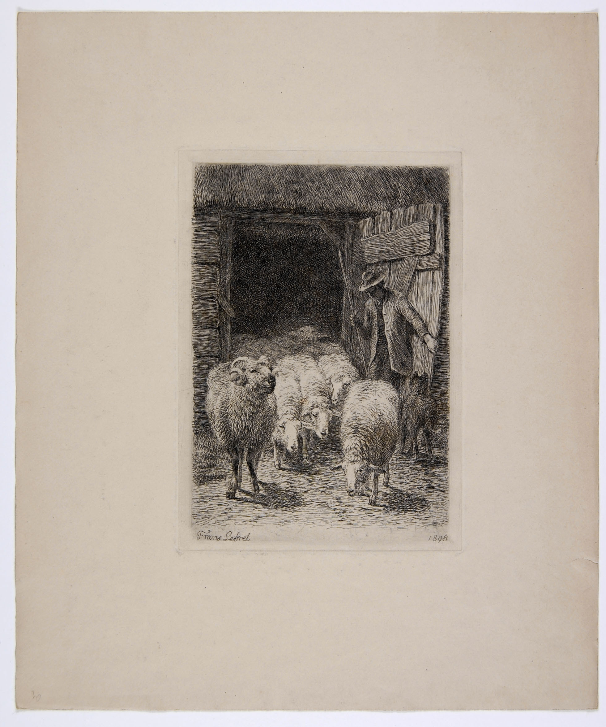 Schaapherder met kudde voor een stal
