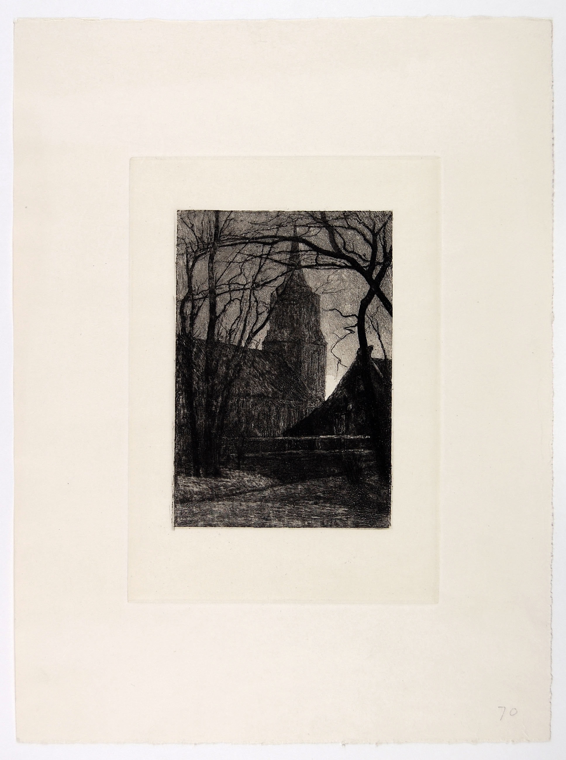 Gezicht op een dorpskerk met omgeving