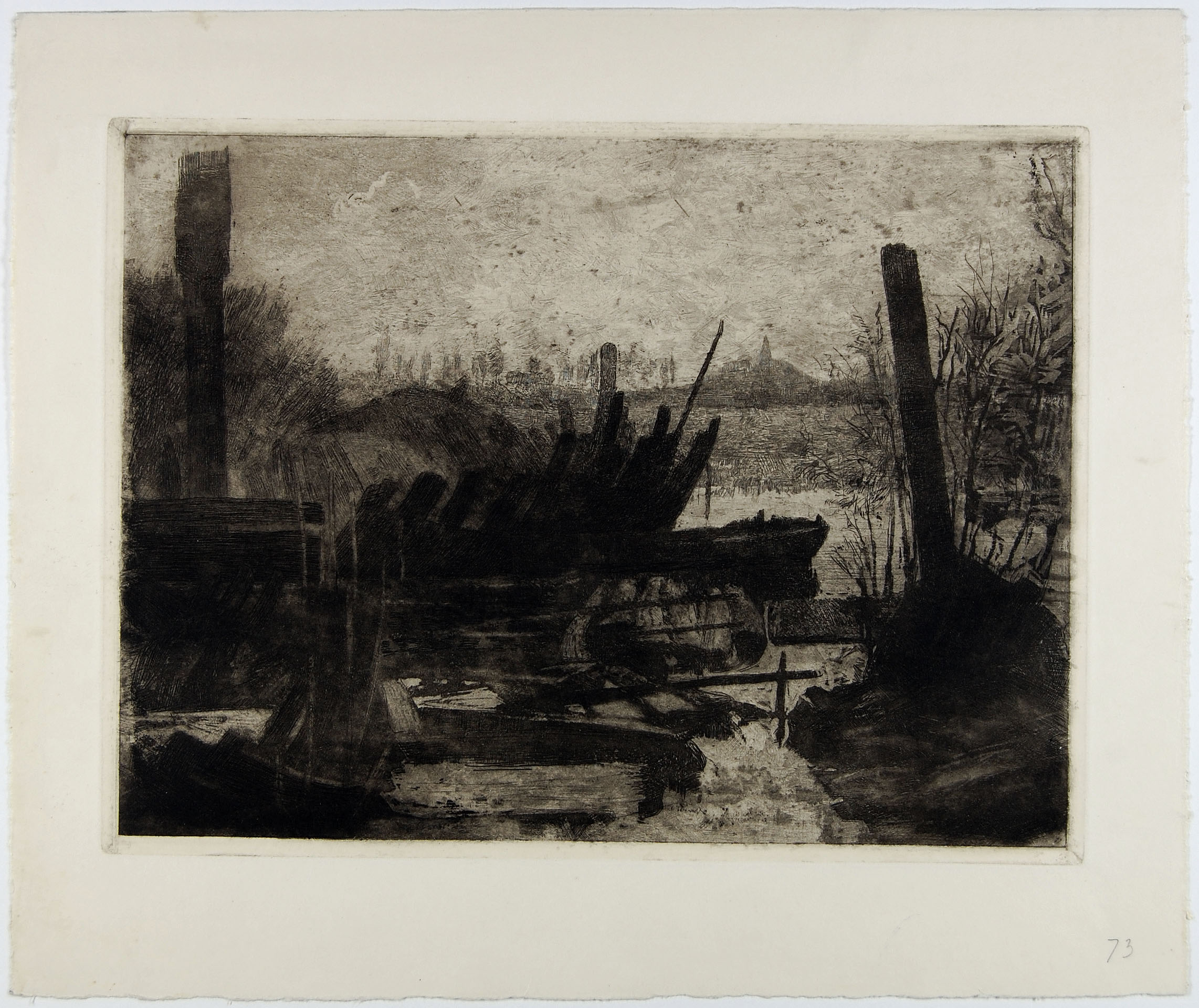 Zeilschepen voor anker liggend aan rivieroever [Land...