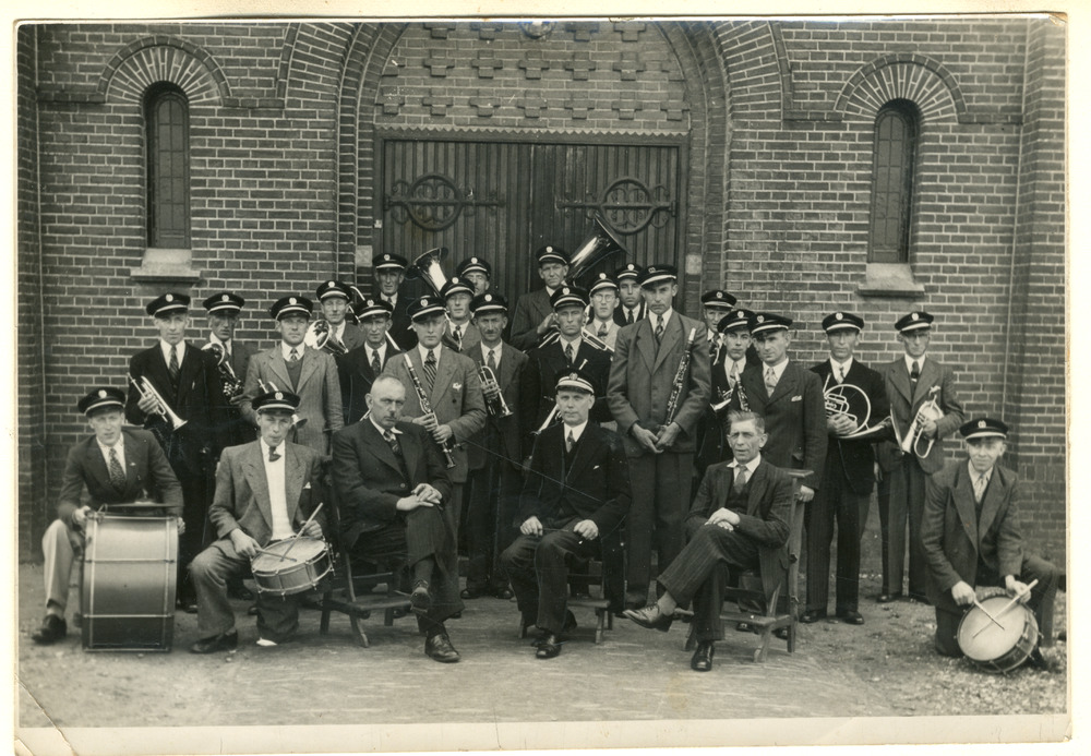 Zwart-wit foto van de drumfanfare P.C.L. te Lobith o...