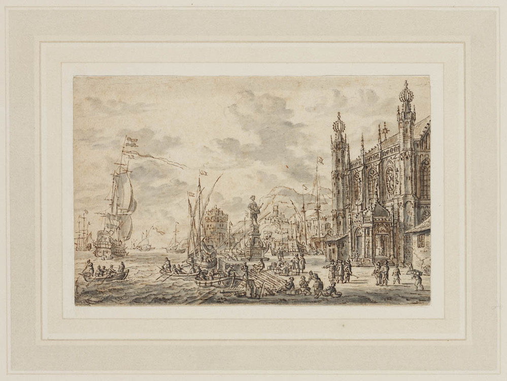 Havengezicht met gotisch gebouw