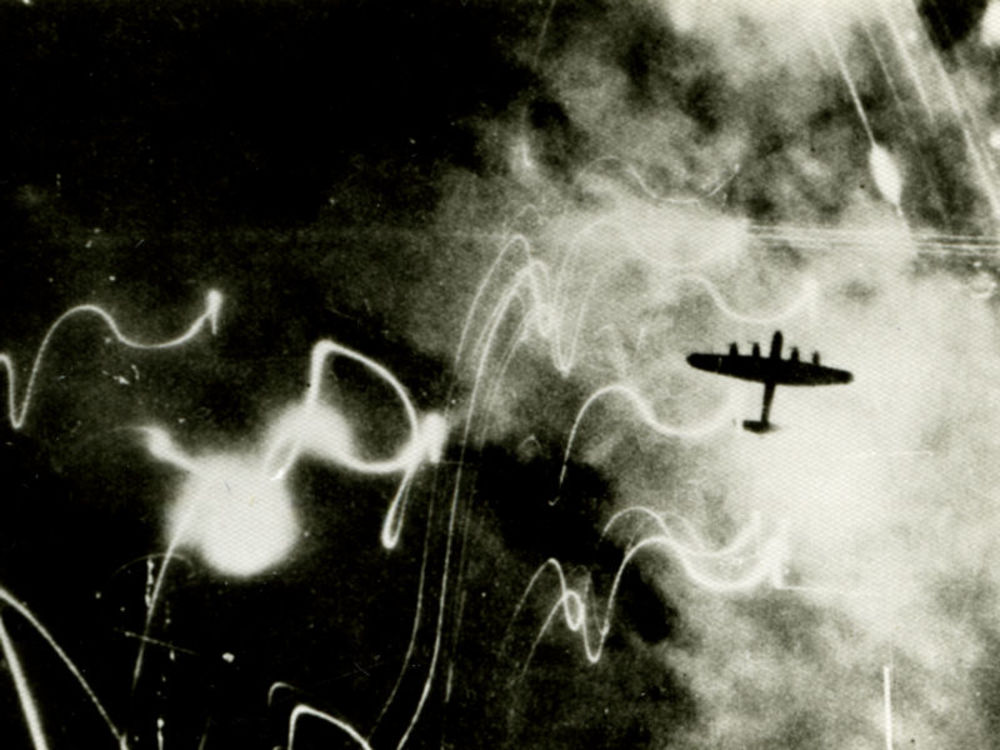 Luchtfoto van een silhouet van een Britse Avro Lanca...